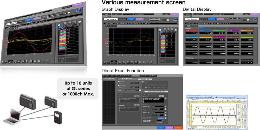 โปรแกรมสามารถแสดงผลและปรับตั้งค่าต่างๆในการบันทึกสัญญาณได้อย่างยอดเยี่ยม สามารถเชื่อมต่อ GRAPHTEC GL series ทุกรุ่นได้สูงสุด 10 เครื่องพร้อมกัน นอกจากนี้ยังสามารถส่งค่าผ่านโปรแกรม Execel ได้อย่างสมบูรณ์แบบอีกด้วย