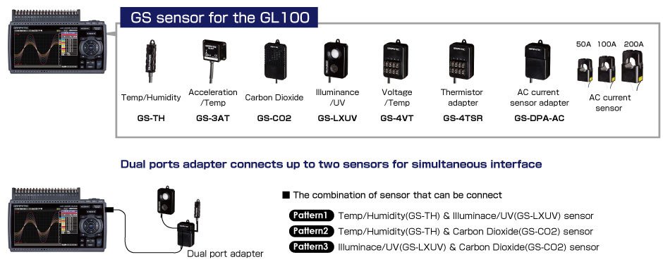 GL840 สามารถเชื่อมต่อเข้ากับ GL Sensor สำหรับ GL100 ได้โดยตรง GS-TH เซ็นเซอร์อุณหภูมิและความชื้น / GS-3AT เซ็นเซอร์ความเร่งและอุณหภูมิ / GS-CO2 เซ็นเซอร์คาร์บอนไดออกไซด์ / GS-LXUV เซ็นเซอร์แสงและยูวี / GS-DPA-AC เซ็นเซอร์กระแสไฟ จึงทำให้ GL840 สามารถเลือกใช้เซ็นเซอร์ได้อย่างหลากหลายครอบคลุมงานทุกประเภท