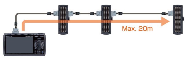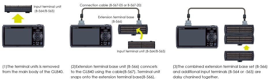 GRAPHTEC GL840 มาพร้อมกับช่องอินพุทสัญญาณมาตรฐาน 20 ช่อง และสามารถขยายช่องอินพุทสัญญาณได้สูงสุดถึง 200 ช่อง ด้วยเพียงการต่อร่วมกันกับอินพุทโมดูล B-564/B-565, สายเคเบิลต่อขยาย B-567-05 หรือ B-567-20 พร้อมกับชุดฐานรอง B-566 ตามภาพที่ปรากฎด้านล่าง