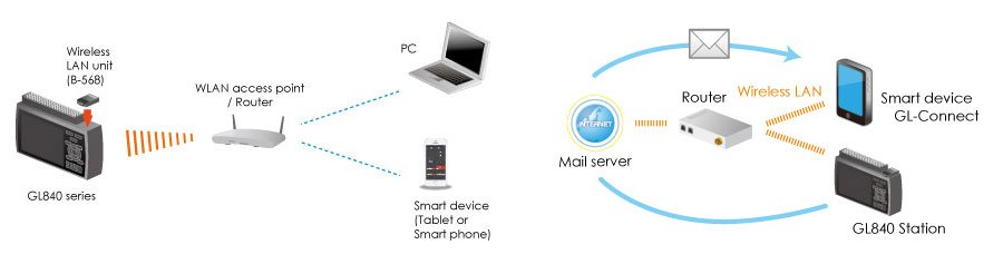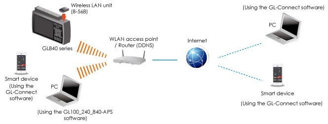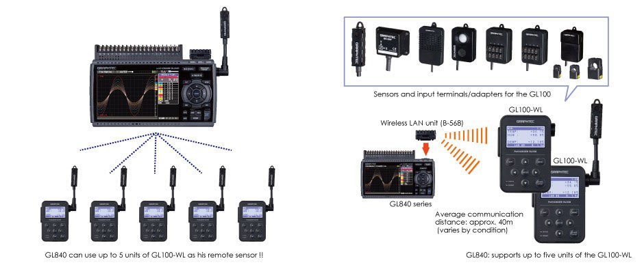 GRAPHTEC GL840 Series สามารถเชื่อมต่อแบบไร้สายด้วยอุปกรณ์เสริม Wireless Lan unit B568 ซึ่งสามารถเชื่อมต่อไร้สายได้หลายรูปแบบ ดังภาพที่ปรากฎด้านล่างเป็นการทำงานร่วมกับ GRAPHTEC รุ่น GL100 ขนาดพกพา โดยเชื่อมต่อกับ GL100 ได้สูงสุด 5 เครื่อง จากการเชื่อมต่อดังกล่าวทำให้สามารถบันทึกค่าสัญญาณในที่ห่างไกลหรือยากต่อการเดินสายสัญญาณ