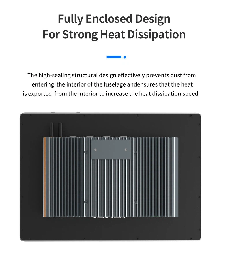 Fully Enclosed Fanless Design for Superior Heat Dissipation.This industrial panel PC adopts a fully enclosed, fanless cooling structure, engineered specifically to operate reliably in dusty, high-temperature, and high-humidity environments. The high-sealing structural design not only prevents dust, moisture, and other airborne particles from entering the internal components, but also efficiently directs internal heat to the outer surface, significantly accelerating heat dissipation without relying on mechanical fans. This not only reduces maintenance frequency but also enhances system stability over long-term use.